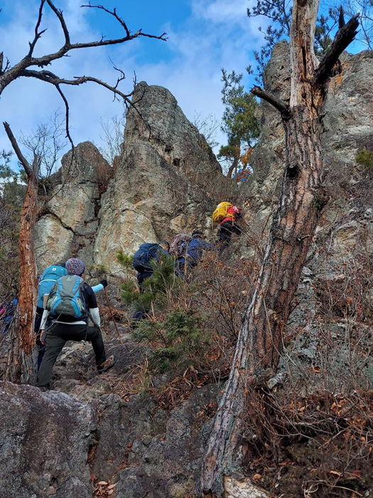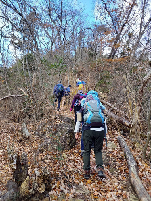 ろまんちっく村第2Pに集合。予定通り8:40スタート。青空が迎えてくれ軽快に歩を進め男抱山に到着。山頂から初冬の田園風景と里山の紅葉を楽しむ。羽黒山からの急な下りは落ち葉で足元が見えにくい状況でしたが、だれ一人転ばず全員無事下山できました。お疲れさまでした。