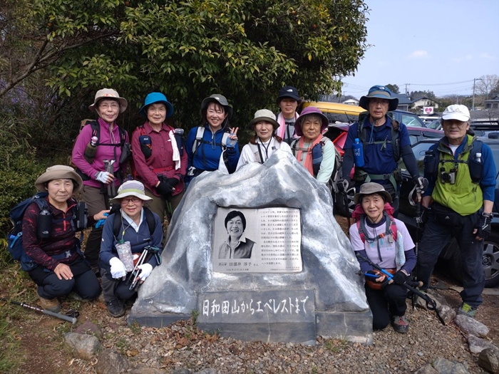 ◆日和田山登山口を出発し、男坂の岩場を注意しながら登って日和田山山頂に。眺望は残念ながらあまり良くないが、近くの巾着田の桜と菜の花が綺麗に咲いているのが見えた。その後、アップダウンを繰り返して北向地蔵まで行き、昼食をとり、下山は座禅岩を経由して駐車場に戻った。駐車場には登山家田部井淳子さんの「日和田山からエベレストまで」と書かれたモニュメントが設置されていた。若い頃から、晩年にはリハビリの為、何度も登っていたようです。帰りに近くの高麗神社の樹齢400年の満開のしだれ桜を見て、無事、壬生駐車場に到着した。